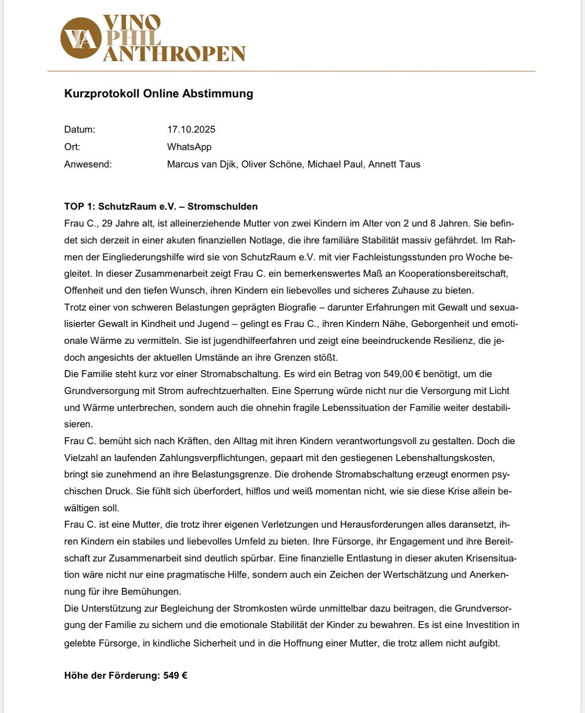 Seit unserer Gründung konnten wir dank zahlreicher Unterstützerinnen und Unterstützer bereits über 100.000 Euro sammeln. Mehr als die Hälfte davon haben wir an regionale Tafeln, Kinderschutzbünde, das Kinderhospiz Sterntaler in Dudenhofen sowie an bedürftige Familien und Einzelpersonen in unserer Heimatregion ausgekehrt. Jede Spende fließt direkt in konkrete Hilfsprojekte und gibt Menschen in schwierigen Lebenssituationen neue Hoffnung.